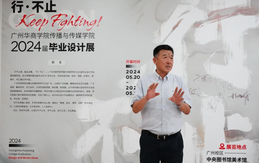视频传播系系主任戴金玲老师在致辞中向各位嘉宾、师生的到来致以欢迎与感谢,并对同学们在作品创作上的成长与表现表示高度肯定,对同学们即将完成学业致以最诚挚的祝福。戴老师表示,大家从怀揣梦想踏入艺术殿堂的新生逐渐成长为专业人才,今天展出的每一件作品都凝聚着同学们的智慧与汗水。立足广东,以讲好广东故事、聚焦现实生活为方向,不断突破自我,希望毕业生们在未来用画笔和镜头展现更多独特的创意。