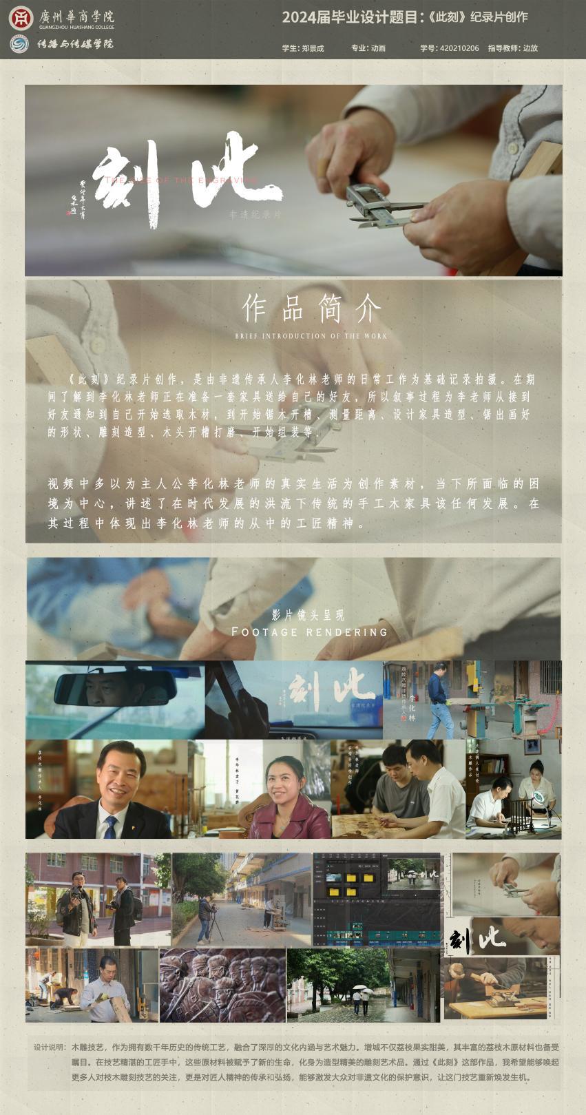增城荔枝木雕刻非遗传承人李化林老师对进行非遗纪录片创作的学生进行了称赞和鼓励。他肯定了纪录片创作对非遗文化的宣传作用,并对毕业展的举办表示大力支持。李化林老师表示,纪录片创作对于非遗文化的宣传与传播起到了很大的作用,这几年有许多学生都拍摄了荔枝木雕刻非遗纪录片,质量较往年也逐渐提升,非常感谢学校以及同学们对增城荔枝木雕刻的宣传与推广。