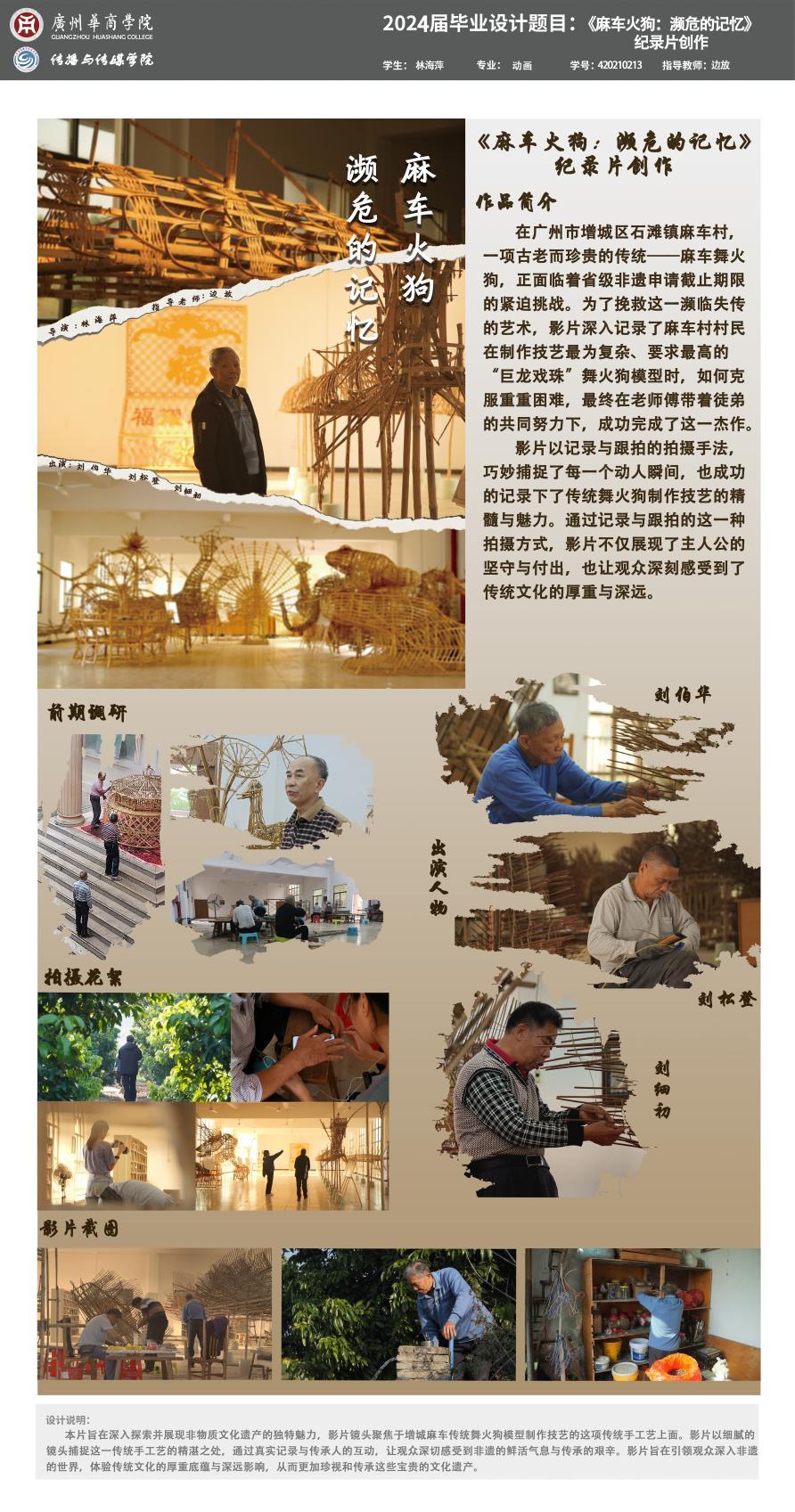 设计阐述:本片旨在深入探索并展现非物质文化遗产的独特魅力,影片镜头聚焦于增城麻车传统舞火狗模型制作技艺的这项传统手工艺上面。影片以细腻的镜头捕捉这一传统手工艺的精湛之处,通过真实记录与传承人的互动,让观众深切感受到非遗的鲜活气息与传承的艰辛。影片旨在引领观众深入非遗的世界,体验传统文化的厚重底蕴与深远影响,从而更加珍视和传承这些宝贵的文化遗产。