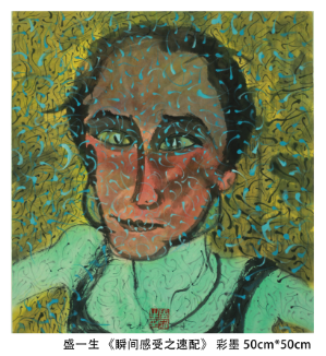 艺术系主任乌日图提出“投入自然怀抱,创造美好图画”的创作理念,其创作热情在自然风景写生过程中得以激发。他的作品以自然物象作为主题引导,为大家呈现出远山苍翠、绿原无垠、碧空如洗、纤云如烟、生机盎然的自然美景。同样以自然风景作为描绘对象,绘画基础教研室主任吕华斌的作品更侧重于主观情感的表达。在题为《故里》的作品中,静谧的田园风光隐喻着作者理想中的家园,表现出人们对逝去的美好生活追忆和人与自然和谐共处的牧歌式生活的向往。通过视觉强化与心理暗示的手法来表现“物·悟”的主题,是黄功翔老师作品《红黄蓝》的特色。他用色彩的对比来强化生活中常见的浴缸这一物象,唤醒我们对洗浴行为的记忆,暗示沐浴不仅能洗去身体与心灵的污垢,还能涤除人们的主观欲念、成见。浴缸藏污纳秽,却又涤除玄鉴,引诱观者对圣洁进行思考。李森老师的系列作品通过瞬间凝固的影像画面表现主题,“惚兮恍兮,其中有象;恍兮惚兮,其中有物”,模糊不清的画面勾起观者对真实、虚无、瞬间、永恒、怀念、遗逝乃至生命意义的思索。在张会锋老师的作品中,我们看到了他对传统文化的关注。他把汉民族的古文字作为“物·悟”的切入点,以“图画”代替“书写”,用西方技法展现中国传统文化,通过古今中外文化的对话与交流,进而思考文化的承继与弘扬问题。侯兆丰老师擅用抽象的几何符号来呈现多义的内涵。《破碎的记忆》系列表现的是对混乱记忆的映像,残缺的圆、黑色的十字、白色的三角等符号这些元素在他的画面中突兀而又谐和,这些个性化的符号具有超现实的象征意义。盛一生老师以独特的视角探索人的精神世界,带有内心自省的意味,他的作品极具内在的张力,对抗、冲突跃然纸上。他的肖像画系列更是如此:粗狂的线条,压抑的躁动,撼动着观者的眼和心,唤起观者对心灵迷失问题的关注,进而沉思、反省。