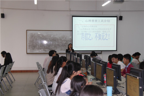 为了做好2014级新生心理普查工作,让新生更好地了解心理测评的理论和意义,侯小花老师对心理测评的性质、内涵做了详细的讲解,并对现场的同学做了一次心理健康测试,以帮助他们科学地认识自己、认识心理测评。