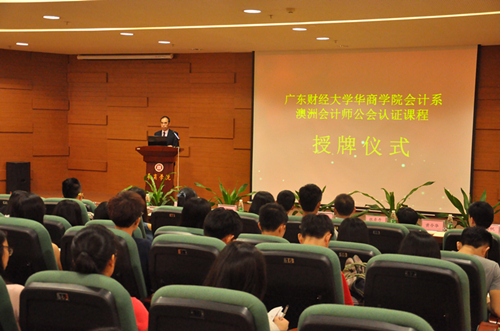 2014年6月24日,“广东财经大学华商学院会计系—澳洲会计师公会认证课程授牌仪式”在我们图书馆学术报告厅隆重举行。_澳洲会计师公会华南委员会委员兼德勤会计师事务所合伙人陈建峰先生、澳洲会计师公会资深会员兼大华会计师事务所高级合伙人张卓奇先生、澳洲会计师公会华南区总监黄今华女士、澳洲会计公会华南区业务拓展经理邵杨帆先生,我们副院长郭银华教授、学院教务处处长李建浔教授、华商合作交流中心刘芳芳主任、会计系学生工作副主任许娜老师,以及我们100多名师生共同参加见证了此次授牌仪式。