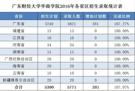 广东省下达普高招生计划5057人,录取5438人,实际增加381人,完成省内原计划的107.53%。其中文史类原计划3407人,录取3663人,增加256人,完成原计划的107.51%;理工类原计划1350人,录取1473人,增加123人,完成原计划的109.11%,美术类原计划300人,录取302人,增加2人,完成原计划的100.67%