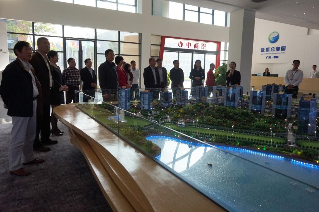 首先,在增城低碳总部园刘沫总经理、颜霖副总经理的陪同下,全部嘉宾参观了低碳园规划图和低碳总部楼等产业园区。该园区是省、市、区重点创业园区,致力于打造以“创新、绿色、总部、共享”为聚合点的“岭南双创一流生态硅谷”。已被评为“广东省绿色创新小镇”、“广州市生产性服务业集聚区”,主要聚集的产业有节能环保、新能源、新一代信息技术、科技金融等战略性新新兴产业。园区总占地面积1000亩,建筑面积150平方米。