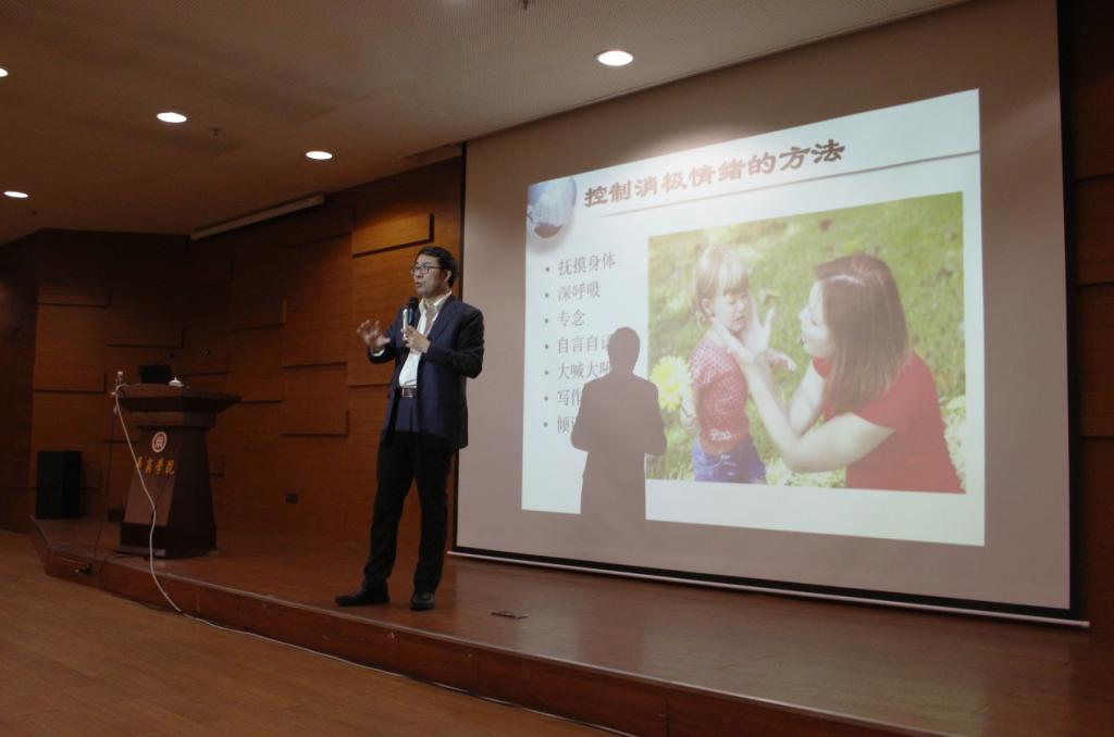 彭教授一边通过生动的演讲,一边给师生们播放相关视频,时而用自由联想的方式与师生们互动,通过猜出教授随机写下的词语与诗词,启示师生们:人是有同理心的,可以设身处地,换位思考,所以我们能感受生命中人性的美好,看到希望会产生喜悦,看到不幸会产生悲悯,这是人类不断进化的福流。他倡导师生们培养慧眼禅心,善于观察周边细小的东西,不要因为过分专注而视而不见。养心比养身更重要,主张多读书,多思考,常做运动,分担家务,帮助别人成长,与人为善等方式达到知行合一的修心,让自己活得快乐与福流。
