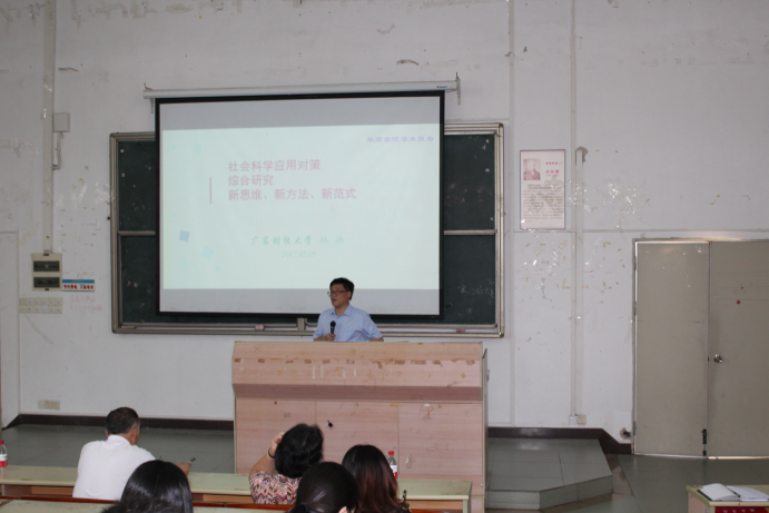 5月9日下午,应我们人事处、科研处的邀请,广东财经大学经济学院院长、国民经济研究中心主任林洪教授于励志楼B307室为我们青年教师做了《社会科学应用对策综合研究新思维、新方法、新范式》的学术报告。支戈壁副院长、张捷副院长、科研处张成诗处长及各教学单位青年教师180余人聆听了这次报告,报告由副院长张捷教授主持。