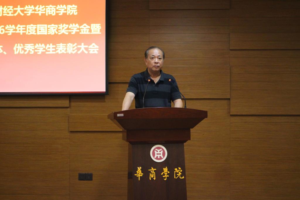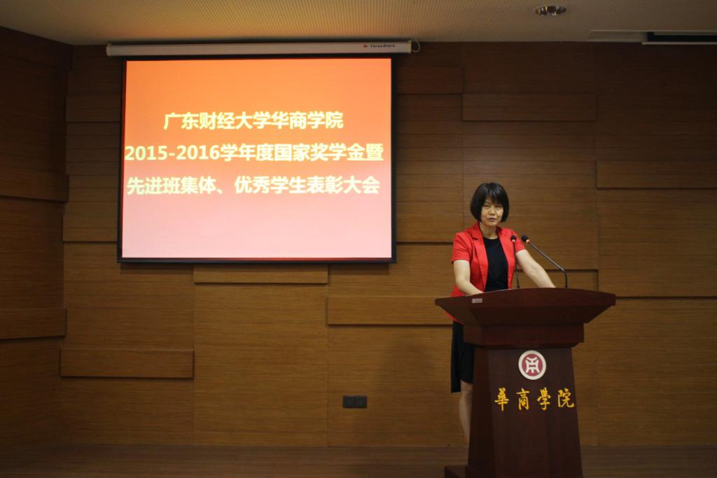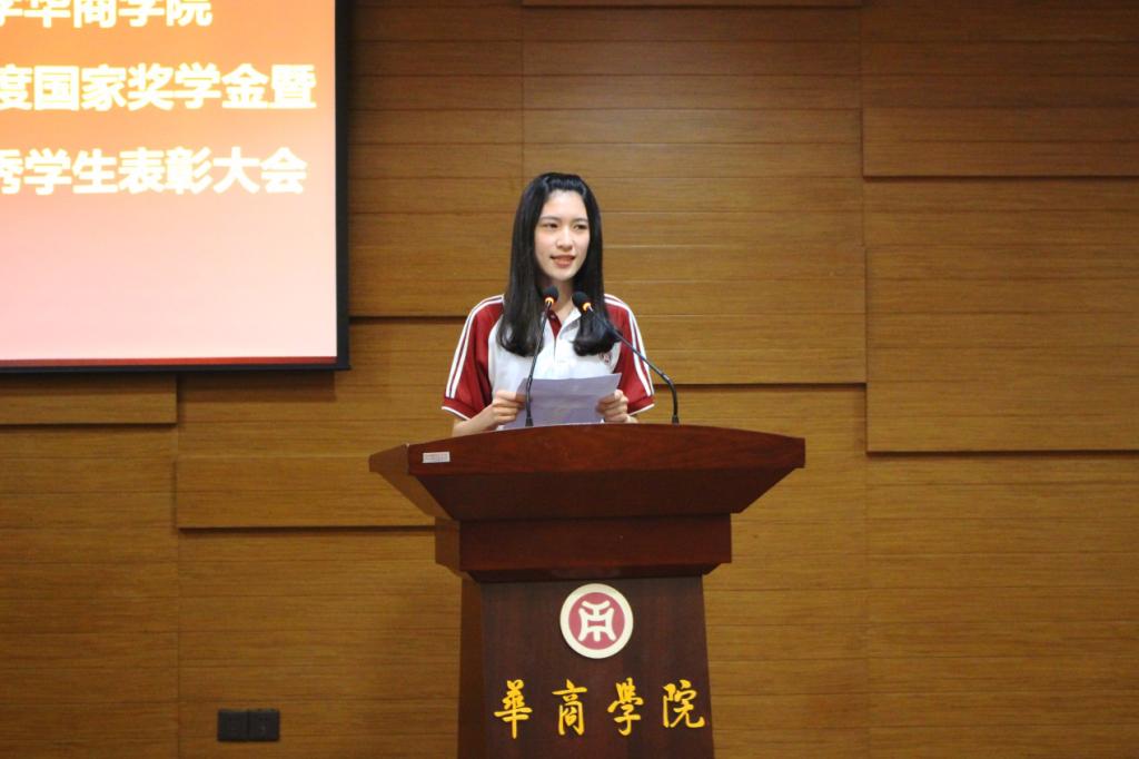 在颁奖仪式中,与会嘉宾分别给2015-2016学年度国家奖学金、励志奖学金、先进班集体、优秀生获得者进行了颁奖。之后,获奖的学生代表游翠婷同学发言。游翠婷同学首先感谢学院给予她一个很好的学习平台,感谢学院的领导、老师在学习上孜孜不倦的教导,感谢同学们在生活中的帮助。她表示将不忘初心,厚积而薄发,立志服务社会,回报祖国。最后,游翠婷同学还希望师弟师妹们继续带着这份热情在华商这个舞台上大放光彩!