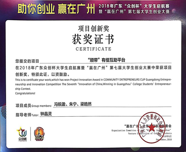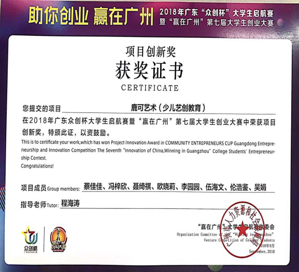 我们两个项目《“顺带”有偿互助平台》、《鹿可艺术(少儿艺创教育)》在2018年广东“众创杯”大学生启航赛暨“赢在广州”第七届大学生创业大赛中,荣获“项目创新奖”。我校创业教育学院获“优秀组织奖”。