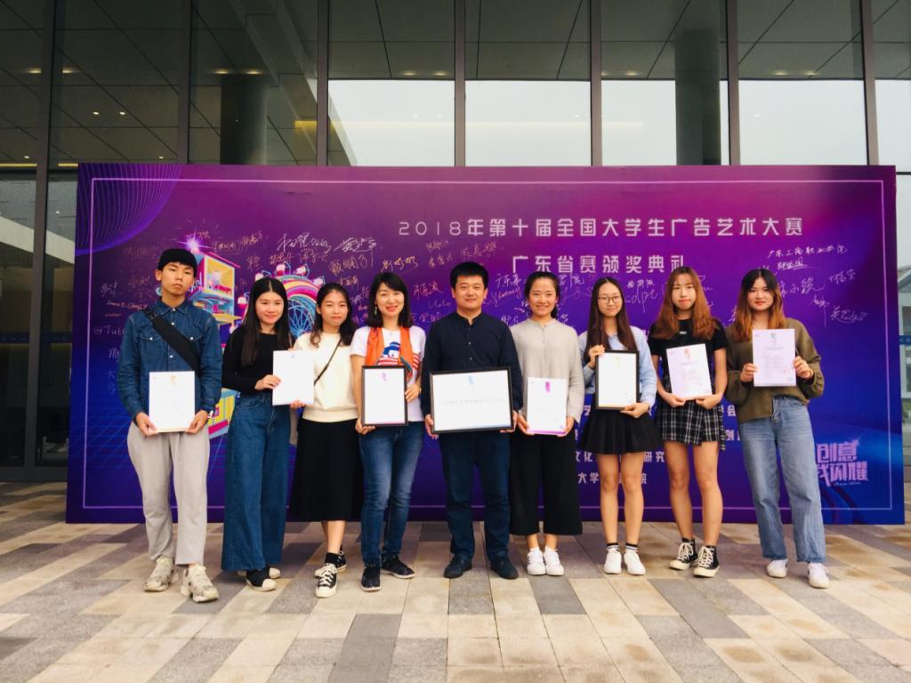 近日,2018年度第十届全国大学生广告艺术大赛广东分赛区颁奖总结交流活动在珠海的UIC北京师范大学-香港浸会大学联合国际学院举行。文学院艺术设计系杨磊副主任带队参加了颁奖典礼,本次大赛,我校学生获奖成绩斐然: