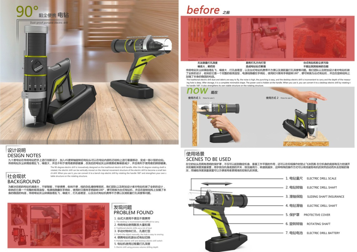在近日落下帷幕的2018年“海峡杯”工业设计大赛颁奖典礼中,我校艺术与设计系蔡嘉奕同学在张宪法老师的指导下,凭借作品《90°阻尘便携电钻》荣获产业装备组金奖,奖金10万元。据悉,本次大赛共收到内地、港澳台等参赛作品12351件,经过层层筛选后,最终评选出特等奖1名、金奖5名、银奖10名、铜奖15名。