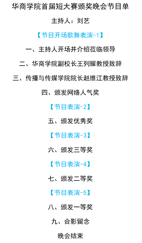 本网讯华商学院首届短视频大赛颁奖晚会将于9月23日晚7时隆重举行。华商学院“首届短视频大赛”正式落下帷幕,为表彰华商首届短视频大赛获奖学生,进一步提升学生专业实践积极性,由华商学院主办、教务处和传播与传媒学院共同承办的华商学院首届短视频大赛颁奖晚会将于9月23日(周三)晚7时在华商学院图书馆报告厅隆重举行,届时,将揭晓本次大赛各奖项获奖作品,同时,还有精彩的文艺演出贯穿其中。华商学院校领导代表、教务处领导代表、传播与传媒伟德体育领导及各系主任、教职工代表将出席本次活动。传播与传媒新媒体中心将对本次晚会进行网络视频转播和图文直播。