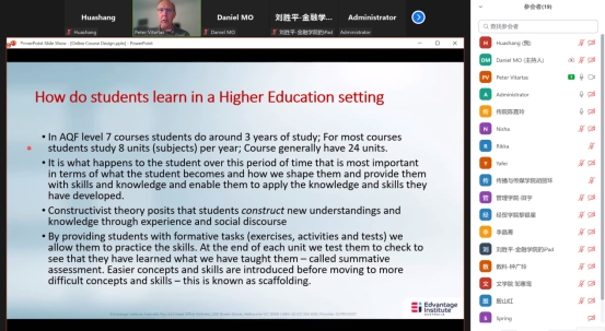王文忠处长认为Peter Vitartas先生对线上课程和评估设计及实践的介绍,为我校与EIA共融课程的设计提供了很好的建议,有助于我校全英双语教师们改善课堂教学模式提升学生的学习积极性。