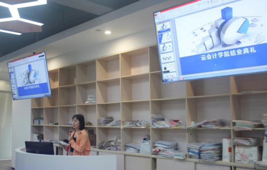 华商云会计产业学院指导老师高艳荣教授作为学院代表发言。她表示,云会计产业学院已经非常成熟,每年来我们云产业学院参观人数很多。在这背后有几方面的支持。第一,我们学校对于应用型人才的培养非常重视,在硬件和软件设备上都给予了巨大的支持。第二,学院的支持。早在系统性提出产教融合概念前,我们学院就一直在做这件事,十年耕耘提前布局,成就了现在的可持续发展。第三,实践部门的各位老师支持,从实习内容、课程设置以及课程成绩指标等方面,整个过程体系非常完善。第四,希望各位同学的加入,能够利用学校提供的平台掌握实践知识,收获令自己满意的人生经历。