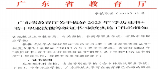 根据教育部《关于在院校实施学历证书+若干职业技能等级证书”制度方案》和广东省教育厅等文件要求,广东省2023年学历证书+职业技能等级证书制度试点工作在我校展开。