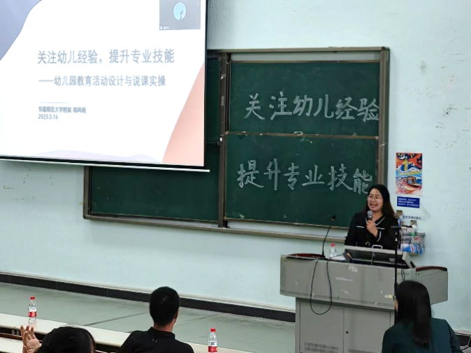 为提升教师教育学院学前教育专业学生师范生技能水平,2023年5月16日下午,华南师范大学附属幼儿园副院长韩凤梅应邀在我校励志楼B407开展以“关注幼儿经验,提升专业技能”为主题的幼儿园教育活动设计与说课实操讲座。增城校区20级全体学前教育专业同学线下参会,21级和四会校区22级学前教育同学通过腾讯会议同步与会。