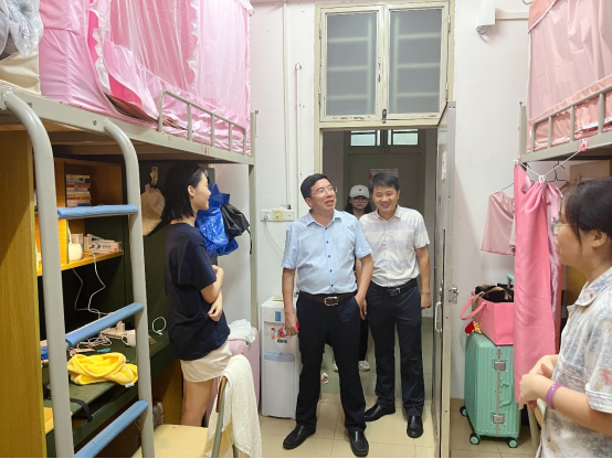 金融学院刘湘云院长带领学工办邱会锋主任、新生辅导员走访宿舍,关心学生。面对同学们在陌生环境时的忐忑与激动的神情,他表示,在接下来的学习生活中,不管遇到什么问题都可以积极寻求学院和辅导员老师帮助。这一暖心问候无疑给予了刚到来不久的新生们一针强心剂,让他们对接下来的大学生活不再胆怯。