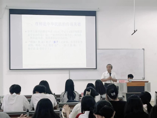 李招忠院长认为,党和政府继承与发展了中华民族尊师的传统美德。他给同学们分享了我党历届领导人尊师的故事经历。毛泽东主席给恩师徐特立60岁寿辰时的致信祝贺;改革开放历史新时期,邓小平在教育界拨乱反正,力主恢复被文化大革命十年遭到损害的尊师重教之好传统;习近平总书记给初中恩师的充满感恩的回信,中共几代领导人用实际行动教诲我们要明白尊师的道理;改革开放以来,加强尊师教育立法,保障教师的各项权益,为中国的尊师制度提供了坚实的法律保障。