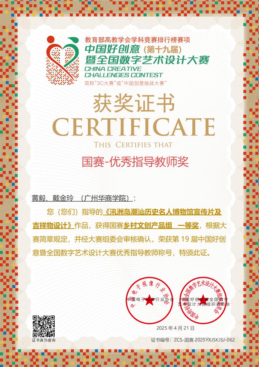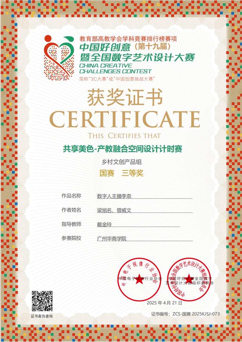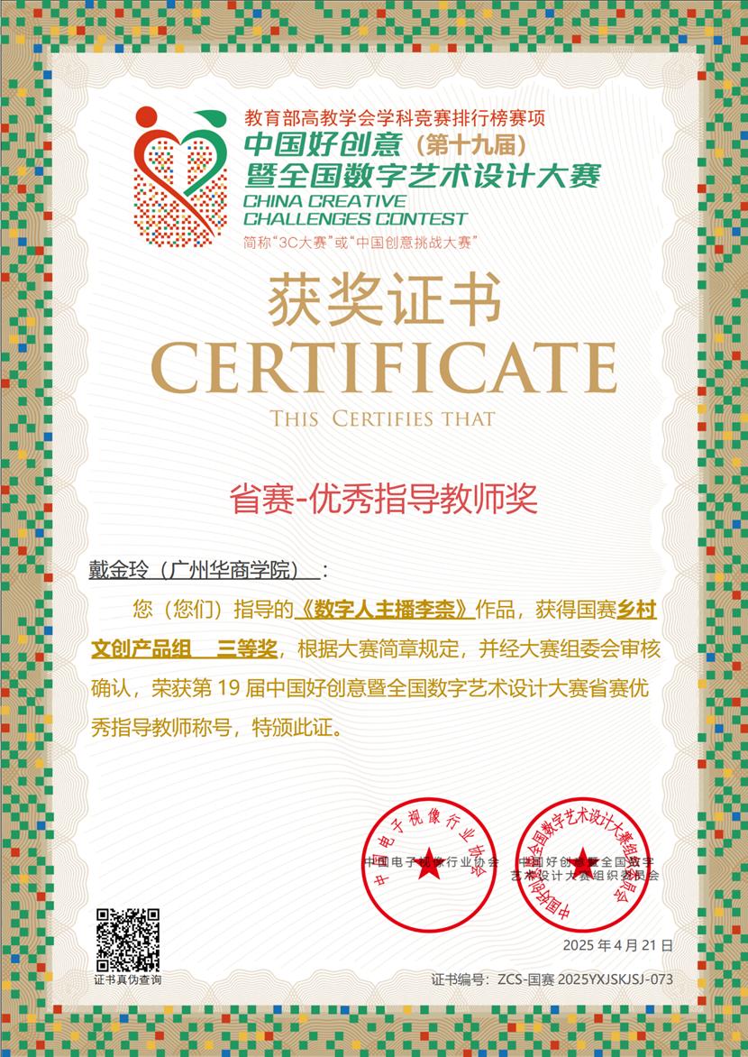 第十九届中国好创意暨全国高校数字艺术设计大赛国赛村基地活动“共享美色——产教融合空间设计工作坊”于2025年4月9日至13日在佛山市南海区狮山镇国赛村圆满收官。视频传播系主任戴金玲老师与黄毅老师、企业导师熊玉才共同指导,带领动画专业11名学子首次参加48小时AIGC赛道,实现零的突破。在48小时云端鏖战中,团队依托AIGC智能设计平台,最终在“乡村振兴”专项组斩获国家级一等奖1项、三等奖1项,以“AI创作设计+文化传承”的创新范式,体现出我校应用型人才培养的实践性。