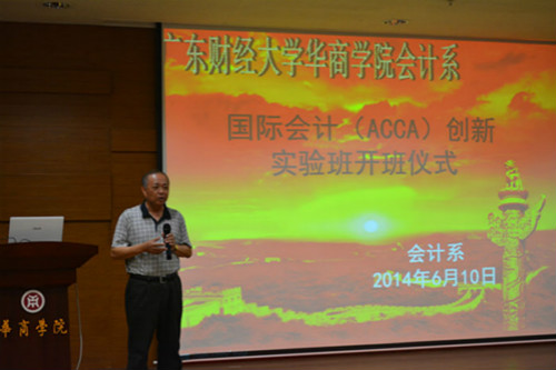 6月10日晚上7点,会计系在图书馆报告厅隆重举行首届国际会计(ACCA)创新实验班开班典礼。开班典礼由我系许娜副主任主持,出席开班典礼仪式的嘉宾有学院陈玉川院长、支戈壁副院长、郭银华副院长、教务处李建浔处长、广东财经大学会计学院陈美华副院长、华商教育集团廖伊曼董事、国际交流中心刘芳芳主任、ACCA驻广州办事处黄颖经理、会计系马玉珍主任、柳学坤副主任等。会计系首届ACCA班的45名学员及部分教师代表、学生代表一同参加了今晚的开学典礼 典礼开始之前,主持人许娜副主任逐一介绍了各位来宾,并邀请陈玉川院长发表重要讲话。陈院长指出学科建设的重要性,希望我们学生的专业水平能在学院不断改善办学条件的过程中逐渐得到提高,并且希望学生的专业知识能运用到日后的学习与工作中,在今后的实践中发挥较好的作用。