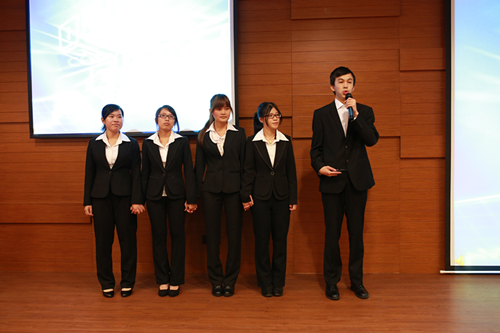主持人首先向我们介绍了本次大赛的参赛人员是经过初赛、复赛的层层选拔后,才来到今天决赛现场的情况,并祝愿他们能在决赛中能赛出风格,赛出水平。随后,六组参赛人员分别入场,以各具特色的PPT和视频展现了团队风采,场下的亲友团时不时为自己团队高呼口号助威,场内气氛相当活跃。