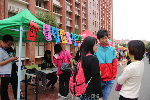 天气渐冷,但校园小路却是热热闹闹的景象,道路一旁摆设着各个社团 的摊位,那是各种各样的社团活动,在道路旁一隅的摊位上挂着“创新设计大赛”几个字。
