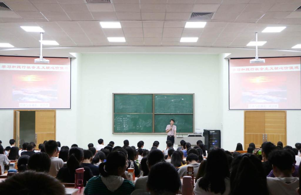 邱会锋副主任围绕“学习和践行社会主义核心价值观”这个主题,从大学生应如何过好大学生活这一角度出发,着重介绍了价值观的意义,通过列举身边发生的例子,告诫同学们要树立良好的价值观念。从价值目标、价值准则、价值行为三个方面阐释社会主义核心价值观的科学内涵,希望我系新生懂得明辨是非,保障自己的基本政治权利、人身权、财产权,增强对于国家和文化的认同。