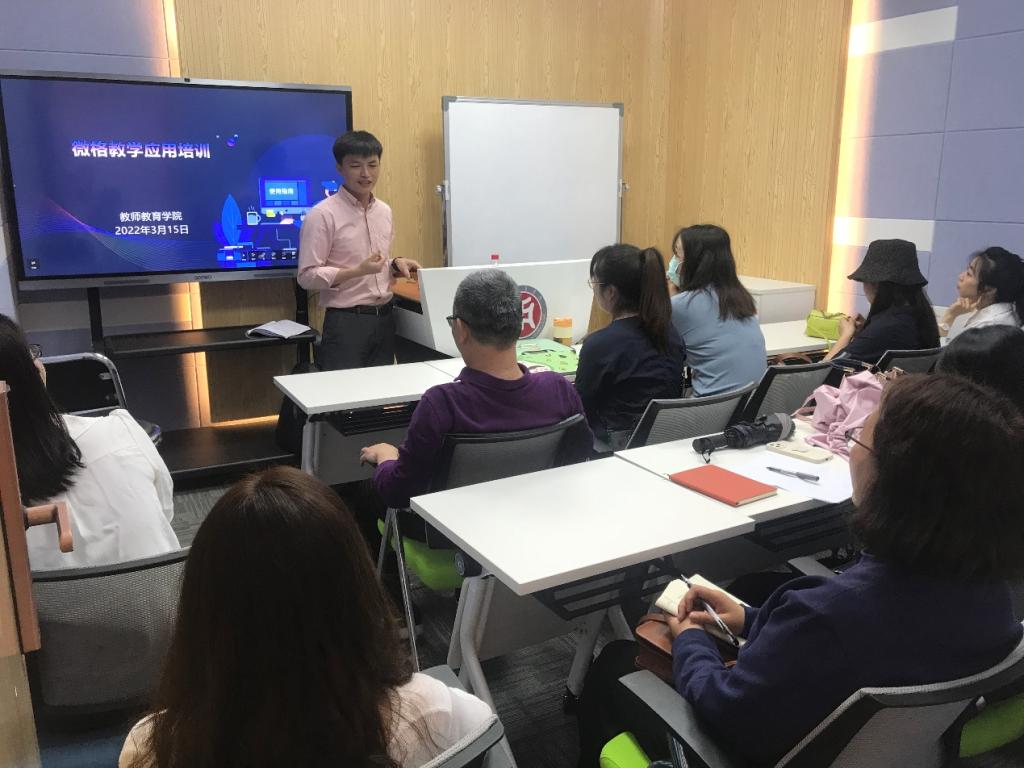 3月15日下午,教师教育学院在厚德楼A308微格实训室举办微格教学应用培训,共有25名青年教师(含线上)参加。