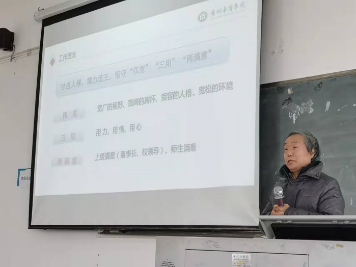 接着,李院长详细阐述了学院的工作理念、工作思路、工作措施和工作困难。伟德体育领导班子的工作理念是甘当人梯,竭力造王,恪守“四宽”、“三用”、“两满意”原则。每个班子成员必须有宽广的视野、宽阔的胸怀、宽容的人格,努力营造一个宽松的环境,凝聚管院全体同仁用力、用情、用心工作,力争做到学院工作让董事长、校领导满意和师生满意,坚持令在华商,策出院方,事落系上的管理原则,找准学院学科专业发展定位,内聚合力,外拓资源,人尽其才,物为人用,凸显华商应用型特色人才培养优势,争当广东乃至全国民办大学管理学科的排头兵和领头雁。
