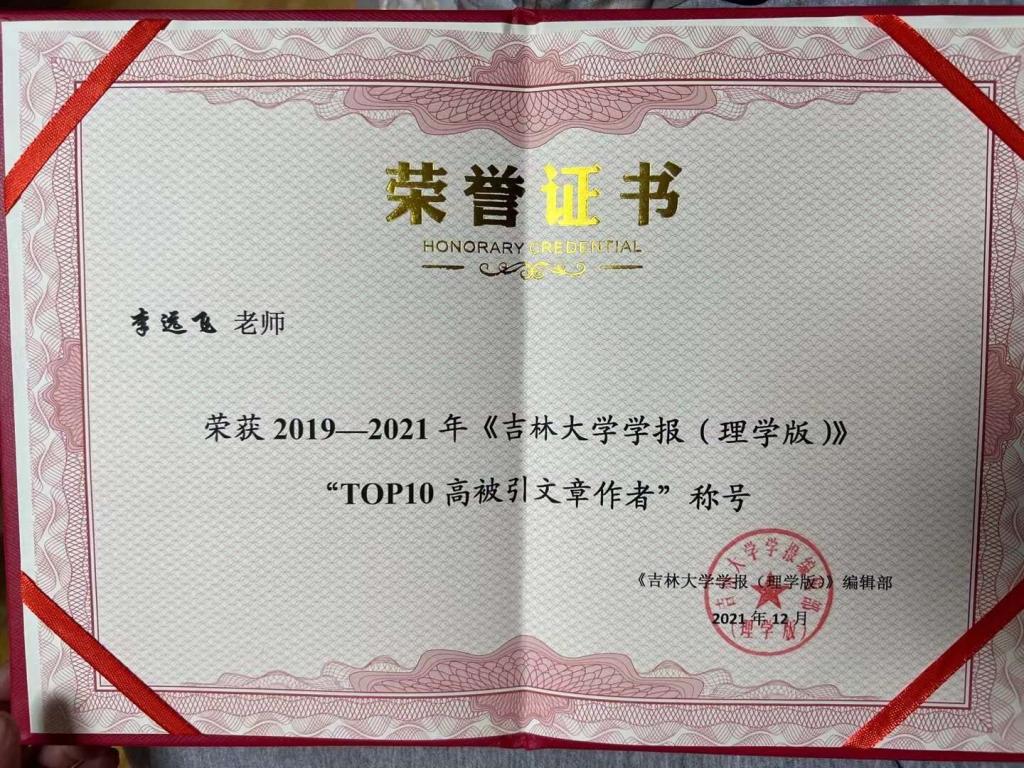 2021年12月,《吉林大学学报(理学版)》编辑部颁发李远飞老师荣誉证书,表彰李远飞老师荣获2019-2021年《吉林大学学报(理学版)》“TOP10高被引文章作者”称号。