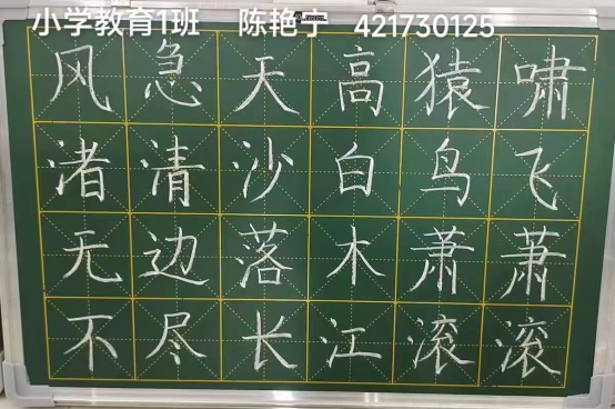 下午,由李世平老师进行“三笔字评分”培训;全体学生跟着李彩芳校长的教程书写粉笔字《登高》,并由指导老师选出优秀作品。