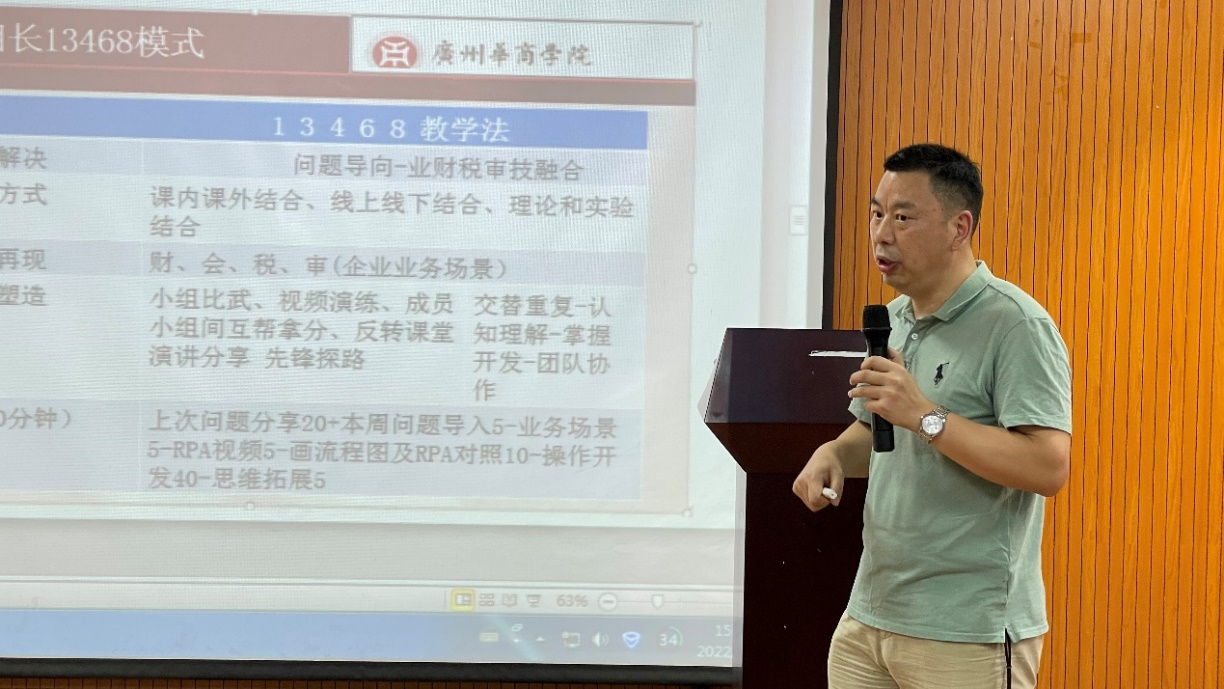 郑朝亮副教授进行关于《RPA财务机器人》课程的分享。郑老师首先从智能化专业的设置初心开始谈起,深刻的分析了国内现行智能化会计专业的发展趋势,随后展示了RPA机器人的课程发展历程,并结合课堂中学生操作的实际案例为各位老师生动易懂的介绍了《RPA财务机器人》的相关课程内容、课程目标以及教学方式。他提出了一个导向,三个结合,四个场景,六个活动以及八个步骤的教学相长“13468”的新模式,致力于切实解决学生们的学习问题。同时,郑老师还明确指出在这种智能化课程的授课中,老师和学生之间应当是相互学习的关系,教学模式应当是一个以学生为主、老师为辅的启发式学习。
