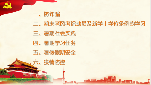 第二,期末考风考纪以及学士学位条例学习。老师们提醒同学们需要提前做好复习、诚信考试、提前检查证件、不带手机入考场。会议上还讲到相关学士学位条例及考试纪律的要求,借此端正同学们的学习态度。