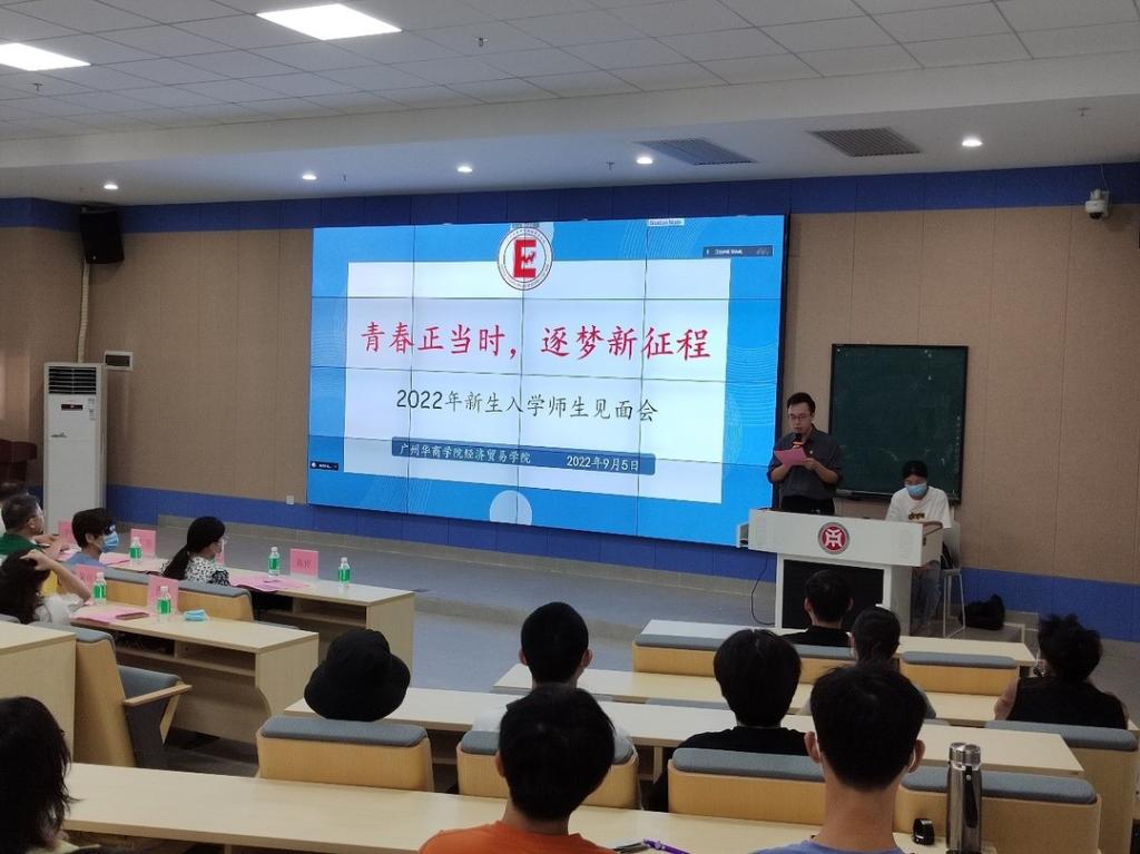 为全面做好2022级新生教育教学管理工作,充分发挥师生合力联动机制,进一步帮助新生了解新学校、适应新环境、开启新生活,2022年9月5日上午10:00,经济贸易学院在四会校区召开2022级师生见面会。本次会议由学工办主任宋元跃老师主持,莅临本次大会的嘉宾有:经济贸易学院院长李广明教授、经济贸易学院副院长张真教授、学院办公室副主任黄明亮老师、跨境电子商务系主任李伟教授、经济统计学系主任石立副教授、跨境电子商务系副主任曹维老师、国际经济与贸易专业教师代表陈婷老师、国际商务专业教师代表黄远香老师、2022级辅导员曾庆威老师。