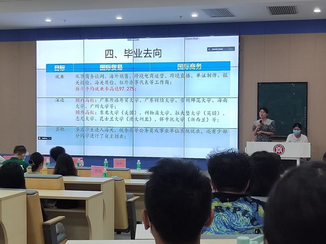紧接着,陈婷老师、黄远香老师、石立老师和曹维老师向大家分别介绍了国际经济与贸易、国际商务、经济统计学和跨境电子商务专业的学习要求和未来就业的方向。老师们建议,同学们要充分利用在校时间,多读书多钻研,同时不忘提高自己的综合能力和综合素质,为未来从业做准备;要积极转变传统的思维方式,更积极主动、更自信笃定、更勇于创新的思维适应各种挑战。通过本次介绍,同学们对本专业方向的概况、培养计划等有了基本的了解,也对自己未来的发展方向有了初印象。