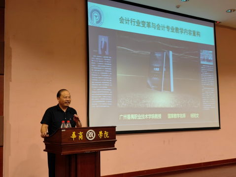 陈美华副校长向国家“万人计划”名师、广州番禺职业技术学院财经学院院长杨则文教授颁发了伟德体育客座教授聘书。聘任仪式后,杨则文教授为我们师生作了题为“会计行业变革与会计专业教学内容重构”的学术报告。