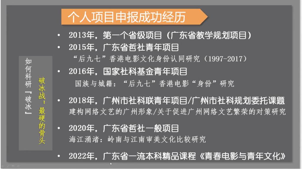 会上,主讲嘉宾陈可唯博士结合自身在广东工业大学的从教经历和学术经验,对如何进行研究选题进行了介绍。她认为,青年教师应根据自身情况,从学术研究、应用研究和教学研究等方面入手,选择适合自己的研究题目和方向(善于利用跨学科领域研究)。分享了个人项目申报成功经历与经验,建议各位青年教师提前做好前期准备工作,不断研究成功立项的项目,并从项目选题、研究内容、研究思路(图示)、重点难点、主要创新点、研究方案及可行性分析、研究基础与工作条件等诸多方面讲解项目申报及撰写注意事项。不断加深自身学术水平,敢于尝试申报,持之以恒,留有充足的科研时间、合理利用学校、学院申报平台,不断打磨好申报书。