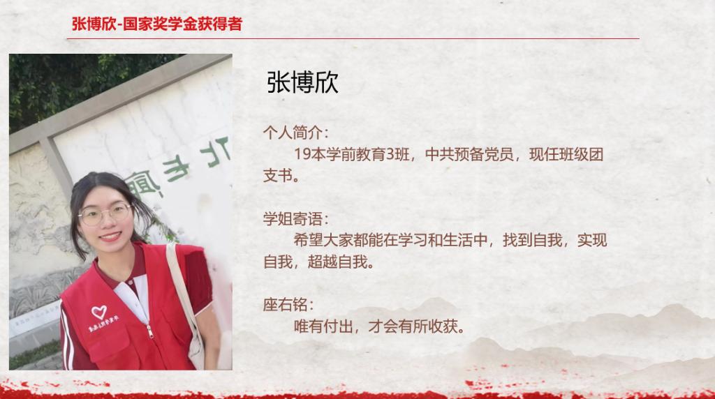 为强化榜样引领,扩大示范效应,促进教师教育学院学子对国家奖学金和国家励志奖学金的了解,鼓励学生共同进步,教师教育学院于2023年3月9日18:30举办了线上国家奖学金、国家励志奖学金获得者分享交流会,此次线上分享交流会的主讲人分别是国家奖学金获得者张博欣同学和国家励志奖学金获得者王嫦红同学。