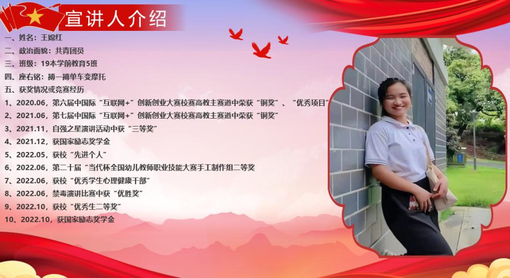 王嫦红同学也毫无保留地向大家分享了她在向国家励志奖学金奋斗学习的道路上所积累的经验,并解读了注意事项和相关文件。她给同学们提出了六点建议∶第一,明确目标,了解国家资助和地方政府资助,明确自己的学习方向。第二,逆袭成长,大学生涯其实很短,时间悄然而逝,要好好珍惜上课时间。第三,刻苦学习,多和同学们一起学习交流。四,参加比赛,在实战中逐渐培养自己的能力。第五,加入社团,在社团中可以遇见一群志同道合的同学,一起把热爱的事情变得专业。第六,多做志愿,在为他人提供服务的时候,我们也能找到自己的价值所在。王嫦红同学的座右铭是“搏一搏,单车变摩托”。她激励同学们,要抓住机会、努力拼搏,就能离目标与梦想越来越近,机会总是留给努力奋斗的人。