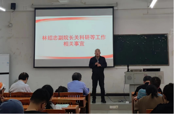 林绍忠副院长就学院科研工作、宣传工作做了具体安排部署。在学院宣传工作方面,林绍忠副院长认为2022年学院宣传工作取得较大进步,希望2023年结合学院工作重点,进一步加强中心建设。在科研工作方面,林绍忠副院长指出目前学院科研工作存在的问题与不足,希望全体教职工积极申报各项科研课题,努力提升个人科研能力。