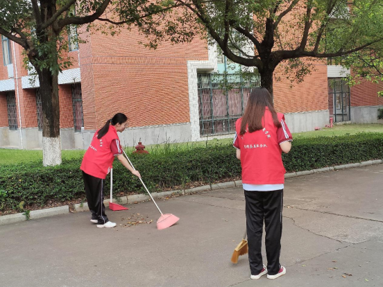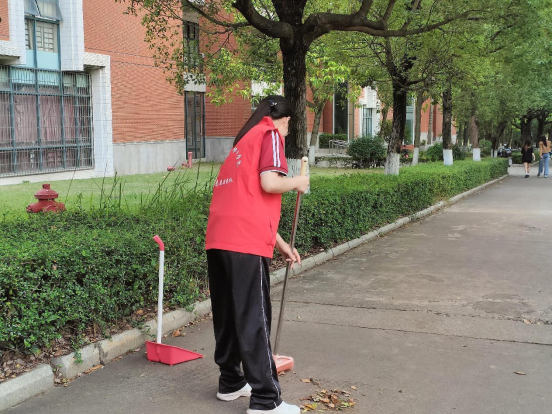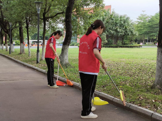 志愿者们手拿扫把、垃圾铲和垃圾袋,辛勤劳动、挥洒汗水,彼此之间团结合作。他们投身于劳动的热情和昂扬向上的活力彰显了青年人独特的风采。在夕阳的照耀下,身穿红背心的志愿者不辞劳苦地进行着志愿活动,成为校园内一道美丽的风景线。