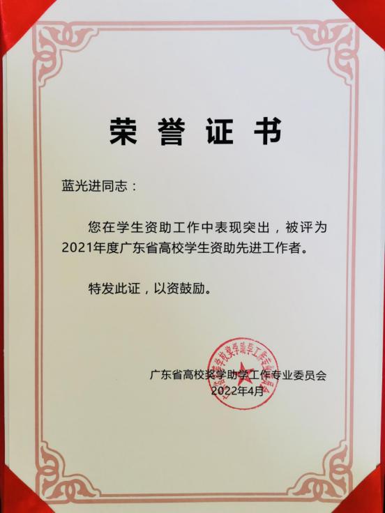 2021年,在教育脱贫攻坚和疫情防控关键时期,我省高校广大学生资助工作者深入贯彻党的教育方针,认真落实国家学生资助政策,全面助力打赢教育脱贫攻坚战和疫情防控阻击战。根据《关于评选2021年度广东省高校学生资助先进工作者的通知》精神,经本人自愿申请、学校评选公示和推荐、广东省经各高校初评推荐、专家评审委员会评审,伟德体育数据科学学院蓝光进老师获评“2021年度广东省高校学生资助先进工作者”荣誉称号。