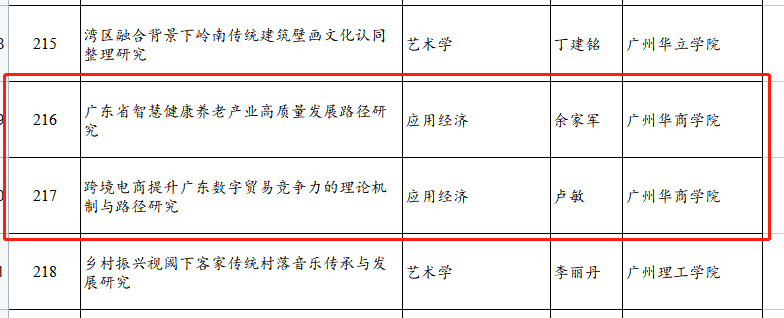 近日,广东省社科规划2022年度学科共建项目立项名单公布,我校余家军老师主持的《广东省智慧健康养老产业高质量发展路径研究》项目、卢敏老师主持的《跨境电商提升广东数字贸易竞争力的理论机制与路径研究》项目位列其中。