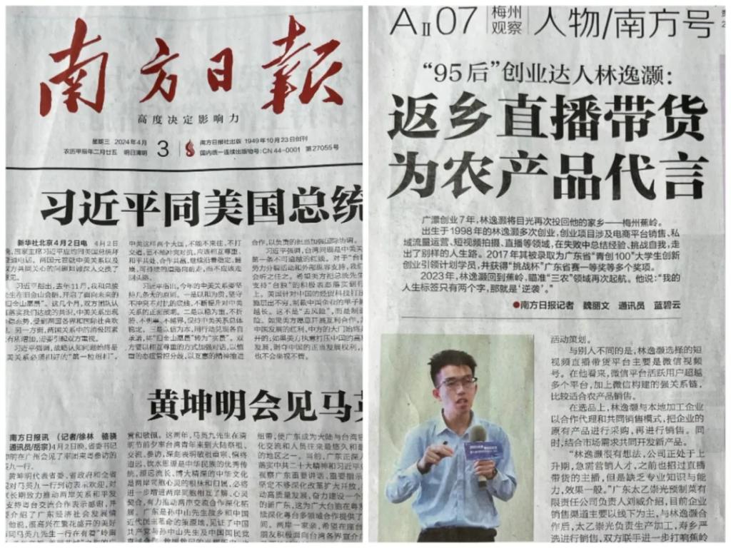 2023年,林逸灏将目光投向了他的家乡——梅州蕉岭。他瞄准了“三农”领域,决定返乡直播带货,为家乡的农产品代言,以实际行动助力乡村振兴,成为了当地乡村振兴的典范。